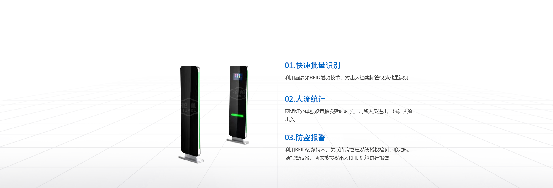 HD-TDMJ01 RFID智能通道門禁主要用于智慧檔案庫房的出入口,利用超高頻RFID射頻技術,對RFID標簽快速批量識別,實現對出入檔案精準識別,聯動報警的功能。采用紅外觸發讀取模式,實現人流統計功能。